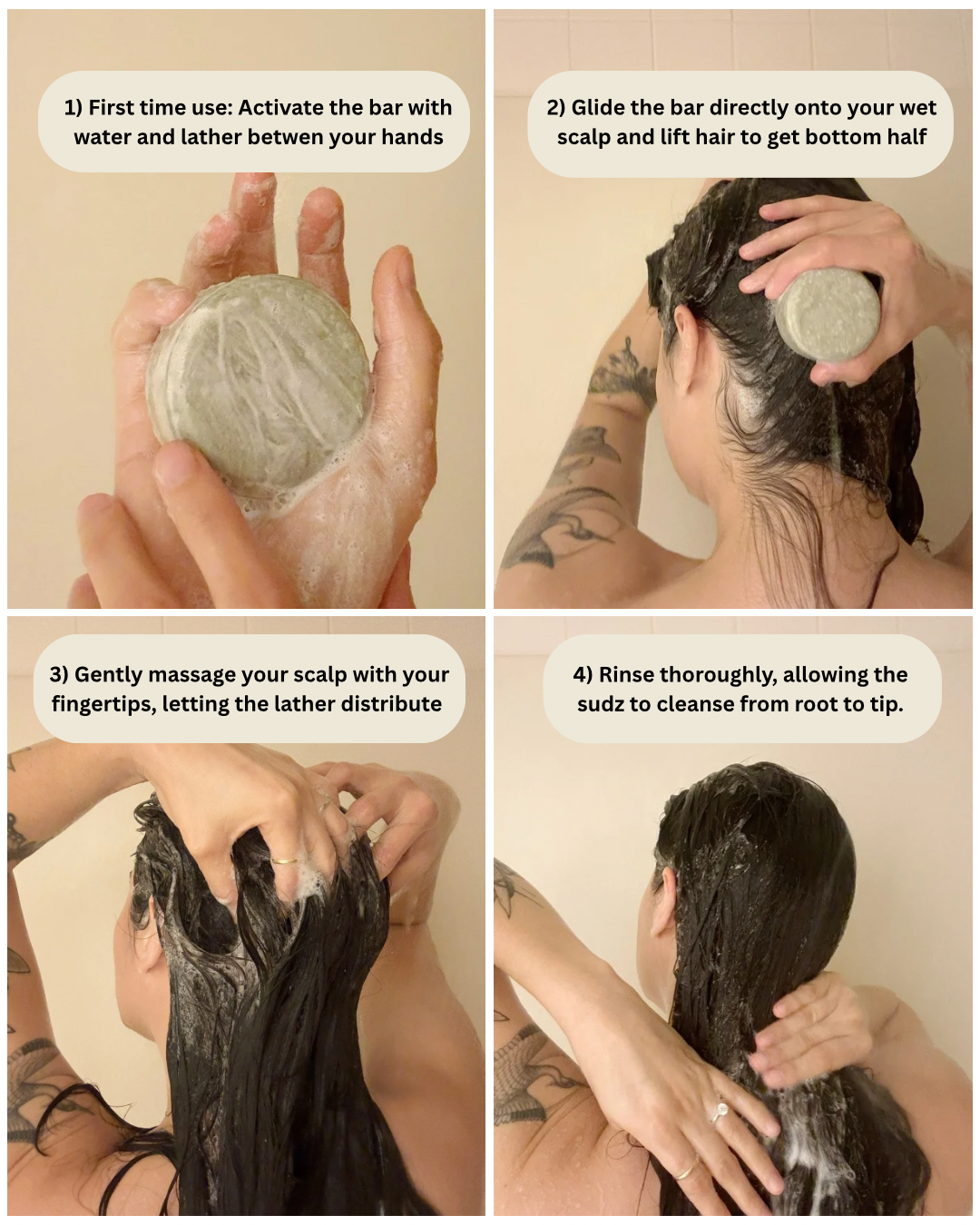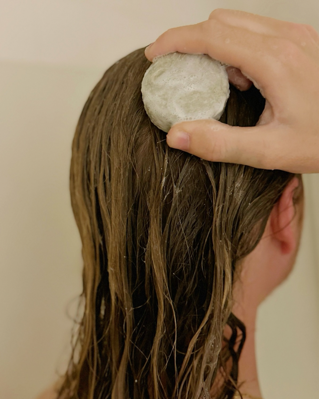 - Activate the bar: Wet your hair and glide the bar directly onto your scalp, or lather it between your hands to release the rich, creamy foam.